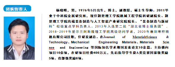团队负责人:杨晓明,中科院金属研究所博士、副教授、硕士生导师,现任荆楚理工学院机械工程学院科研副院长、“装备制造与新材料” 校级重点学科负责人。
